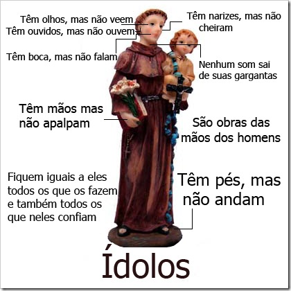 Os ídolos deles são prata e ouro, obra das mãos do homem. Têm boca, mas não falam; têm olhos, mas não vêem; têm ouvidos, mas não ouvem; têm nariz, mas não cheiram; têm mãos, mas não apalpam; têm pés, mas não andam; nem som algum sai da sua garganta. Semelhantes a eles sejam os que fazem, e todos os que neles confiam.